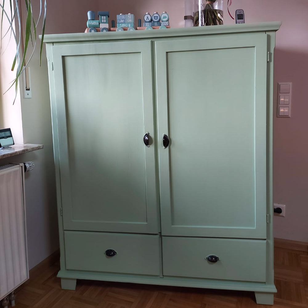 Du kannst die Farbe mit dem Pinsel, mit der Rolle und auch mit dem Sprühgerät aufbringen. Wir empfehlen immer mit dem Pinsel zu streichen da sich hierbei die besondere stumpfmatte, samtige Optik der Kreidefarbe optimal entfaltet.