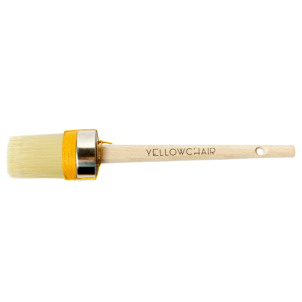 Pinceau anneau ovale, poils poils synthétiques, bride courte fil jaune, manche bois brut