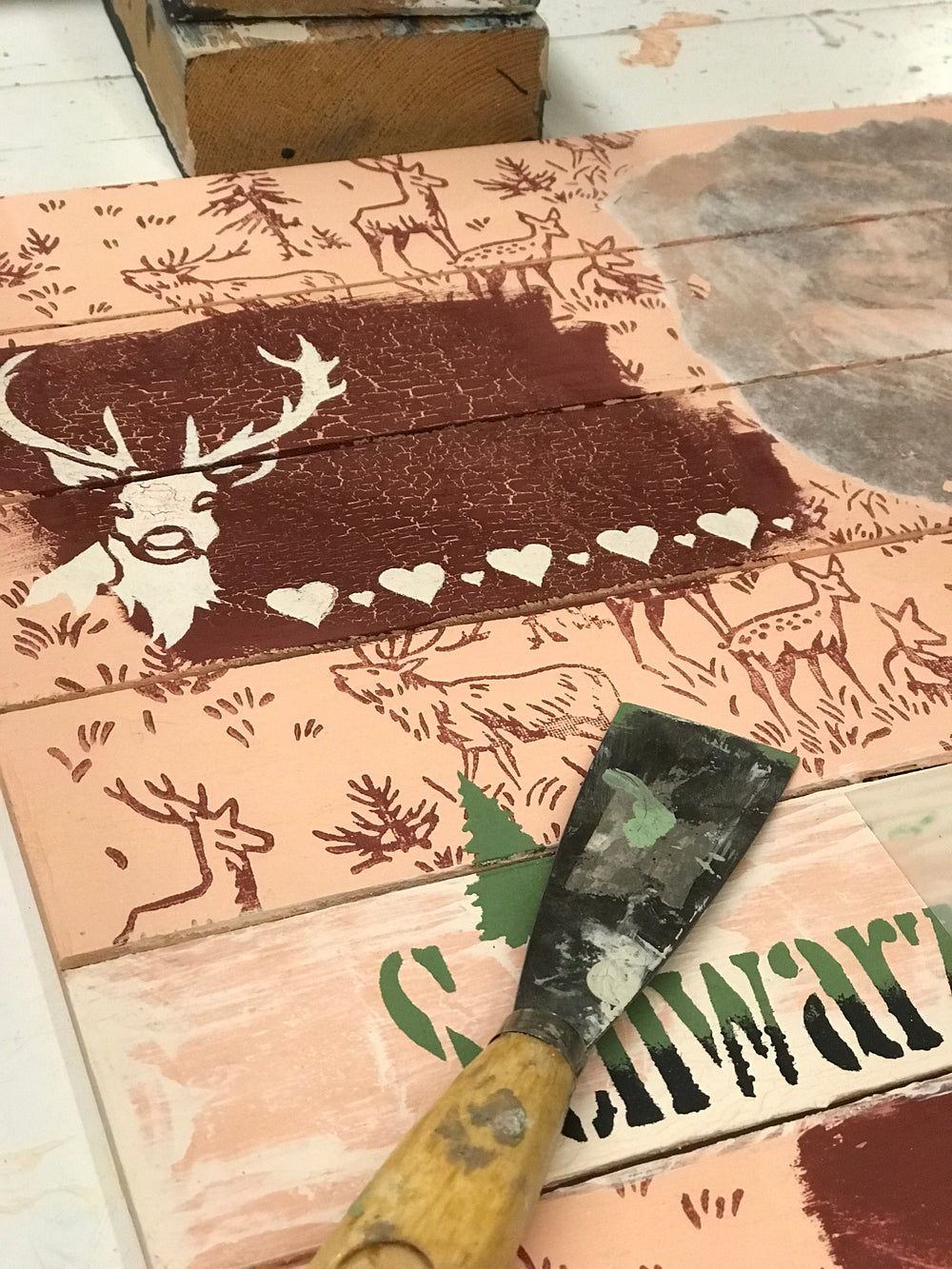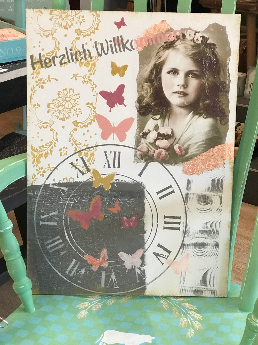 Découpage, rempotage, craquelé, grainage, patine, pochoir. Ce sont des techniques que nous véhiculons en lien avec la peinture à la craie yellowchair et que nous mettons en œuvre sur une enseigne en bois sous forme de collage.